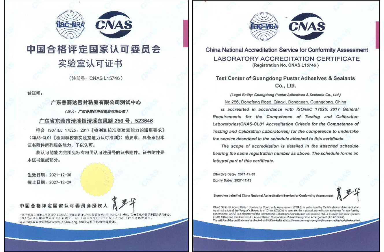 2021年12月30日,廣東普賽達密封粘膠有限公司測試中心(以下簡稱“普賽達測試中心”)成功通過中國合格評定國家認可委員會(CNAS)認可并獲得中國合格評定國家認可委員會實驗室認可證書(注冊號:CNAS L15746),標志著普賽達測試中心具備了國家認可的實驗室管理水平和檢驗檢測能力。
