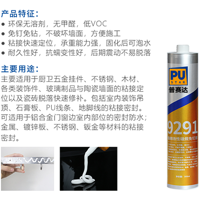 主要用于廚衛(wèi)五金掛件、不銹鋼、木材、各類裝飾件、玻璃制品與陶瓷墻面的粘接定位以及瓷磚脫落快速修補(bǔ)。包括室內(nèi)裝飾吊頂、石膏板、PU線條、地腳線的粘接密封。可適用于鋁合金門窗邊室內(nèi)部位的密封防水;金屬、鍍鋅板、不銹鋼、鈑金等材料的粘接密封。